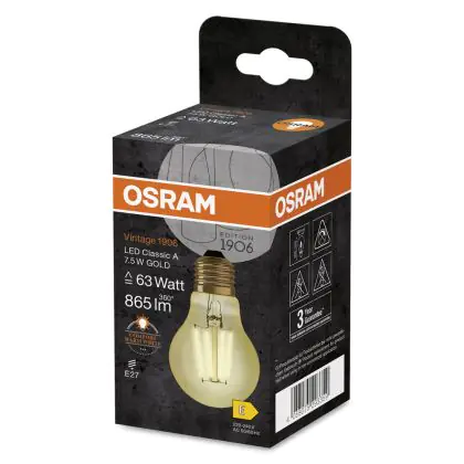 Cette ampoule Osram Vintage 1906 LED E27 Poire Filament Dorée 7.5W 865lm - 825 Blanc Très Chaud | Remplacement 60W est l’alternative idéale pour la remplacement de votre ampoule classique de 63 W. La technologie LED intégrée vous offrira de nombreux avantages. Les ampoules à incandescence traditionnelles ont une durée de vie limitée. Cette alternative LED vous permettra de profiter d’un éclairage durable et fiable.